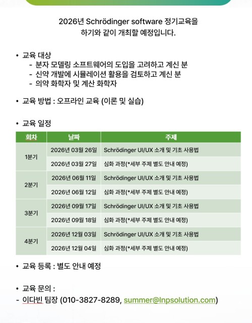 [LNPsolution] 한국의약화학회 제1회 학술정기대회 부스참여 안내 한국의약화학회 제 1회 학술정기대회 개막! 엘앤피솔루션은 Schrödinger 한국 공식 파트너로서연구자 여러분께 소프트웨어 세일즈·교육·기술지원을 제공합니다.특히, 분자동역학(MD)·도킹·FEP+ 등 최신 슈뢰딩거 워크플로우를 기반으로신약개발 연구에 필요한 강력한 솔루션을..